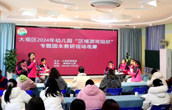 12月6日上午,安慶市大觀區“區域游戲組織”專題園本教研現場觀摩活動在高琦幼兒園本部舉行,大觀區學前教育教研員章喜香主持,區屬各公、民辦幼兒園園長及骨干教師參加觀摩研討。