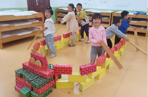 在區(qū)域游戲中,小朋友們用材料創(chuàng)造性地搭建各種不同的龍舟,他們玩起了賽龍舟游戲,孩子們奮力“劃槳”,一個個鉚足了勁,奮力喊著:“一二一、加油、一二一、加油……”玩得不亦樂乎,幼兒園充滿了孩子們快樂的笑聲,讓孩子們懂得了團隊合作的力量!