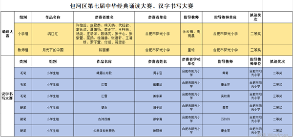近日,包河區(qū)第七屆“誦讀中國”經(jīng)典誦讀大賽與“筆墨中國”漢字書寫大賽評選結(jié)果揭曉。在兩項賽事中,合肥市陽光小學師生斬獲佳績,共八項作品獲獎。