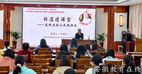 下午的專題講座,國家級大別山民歌傳承人余述凡以《非遺進課堂——發現大別山民歌的美》為題,將原生態演唱與曲調解析深度融合,讓老師們親身感受到了本土音樂的文化密碼,為民歌教學從“教唱”到“傳神”提供了切實可行的路徑。六安市教研員朱凌則以《感受美、鑒賞美、表達美和創造美》為題,將音樂的理論高度與教學實踐緊密結合。她引導教師從教育家精神的視角重新審視日常課堂,激發了與會教師對美育使命的深層思考,實現了從教學技術到教育哲學的升華。