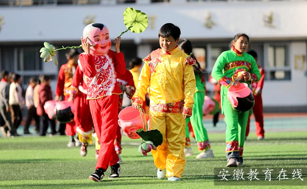 近日,安徽省黃山市屯溪區奕棋鎮中心小學操場上,學生頭戴大頭面具,手持荷花道具,在老師指導下反復練習動作,徽州傳統民俗“舞和合”在此煥發新活力。