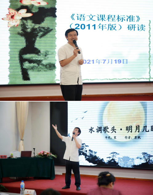 上午,安徽省特級教師、安徽省教科院小學語文教研員吳福雷老師為大家?guī)碇v座《就語文新課標的學習談幾個問題》。吳老師暢談語文課程標準提出的“前世今生”,從根本上把握課程標準修訂的宗旨和中心。接著,吳老師詳細地闡述了新語文課程標準(2021版)的修訂過程,從總體思路、修訂原則和重點等方面進行知識梳理,使得課程標準的修訂過程動態(tài)化、系統(tǒng)化。在對于新課標的解讀過程中,吳老師以新課標的總標準即全面提高學生的語文素養(yǎng)為依托,重點介紹了語文學科教育的幾個特點,并通過經典的課堂教學實錄,將教學智慧融入實際課堂之中,使在場老師深受啟發(fā)。吳老師還將新舊課標進行多維度、多層面的對比,找出其不變的根本和適應時代變化的新概念和新導向。這樣的新思考、新角度,使得培訓課堂有生成,有收獲。課堂的氛圍在吳老師《水調歌頭·明月幾時有》的激情吟誦中,達到高潮。