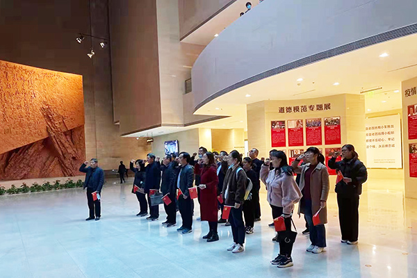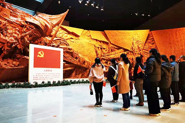 渡江戰役紀念館一樓大廳,面對鮮艷的中國共產黨黨旗,黨委副書記許云生同志帶領黨員教師重溫入黨誓詞。鏗鏘有力的宣誓聲,表達了“不忘初心、牢記使命”的堅定政治信念和矢志不渝的奮斗信心和決心。