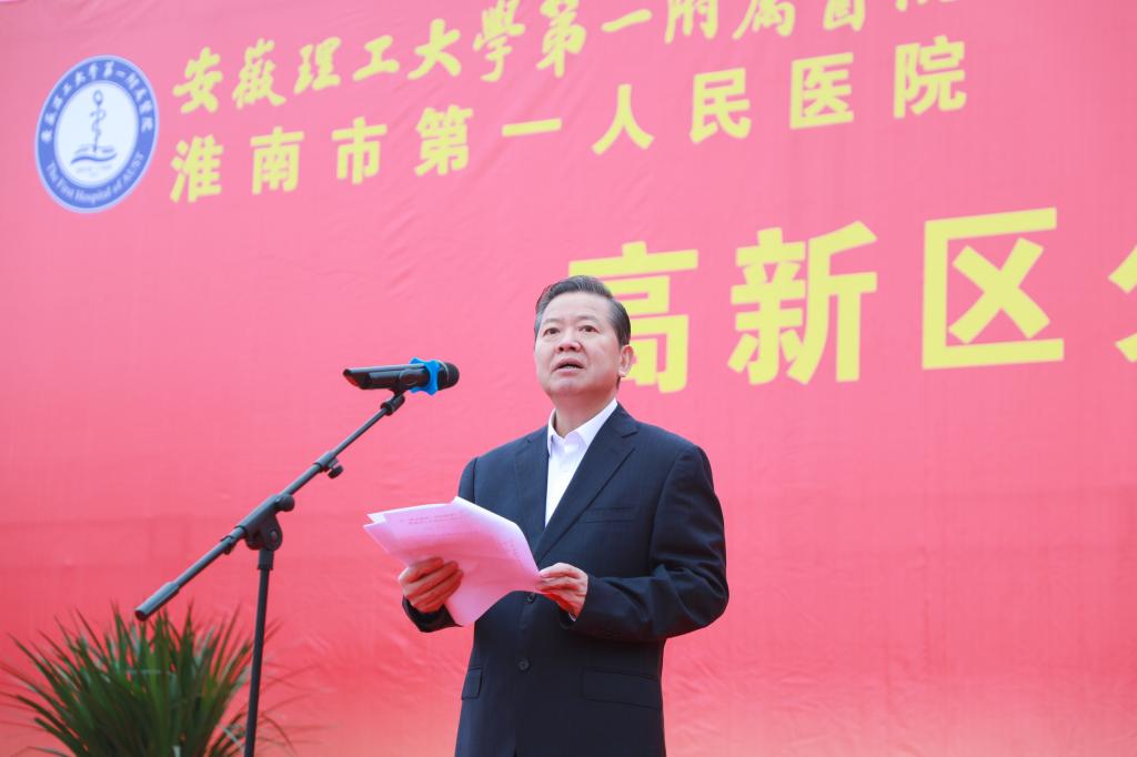 汪世福致辭。他代表市衛健委向高新區分院全面開診表示熱烈祝賀!他認為,高等醫學教育是醫療衛生事業可持續發展的動力源泉,淮南市第一人民醫院整建制劃轉至安徽理工大學,是深化市校合作大局和城市長遠發展的戰略選擇,是校醫融合、加快建設高水平綜合性大學的大事,是淮南市衛生健康事業發展中的要事,更是淮南市醫療衛生發展歷程中具有深遠意義的里程碑。他表示,市衛健委將一如既往地支持高新區分院的建設與發展,希望醫院憑借高尚的醫德、精湛的醫術、周到的服務為師生群眾提供高效便捷的醫療服務。
