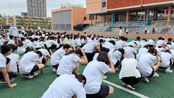 到達(dá)操場后,各班安全員立刻開始人數(shù)核對工作,確認(rèn)后向班主任報告人數(shù)并依次向疏散現(xiàn)場指揮員報告,指揮員將統(tǒng)計結(jié)果報告指揮長朱霖同志。隨著解除警報的聲音響起,標(biāo)志著演練進(jìn)入尾聲。此時,全體師生已經(jīng)形成了整齊的隊列,大家靜靜地蹲在地上,雙手緊緊抱住頭部,這是在模擬空襲來臨時的自我保護(hù)動作。