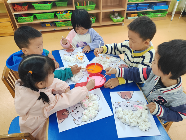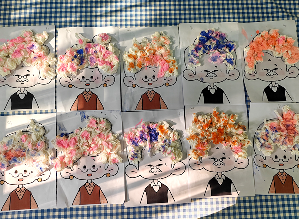 給爺爺奶奶染頭發啰!孩子們一起給爺爺奶奶外公外婆染了一個有創意的發色。“我要給奶奶染個紅色的頭發。我給爺爺染個藍色的……”每一件作品都充滿了孩子們的心意和創意,表達他們對長輩的尊敬和愛。